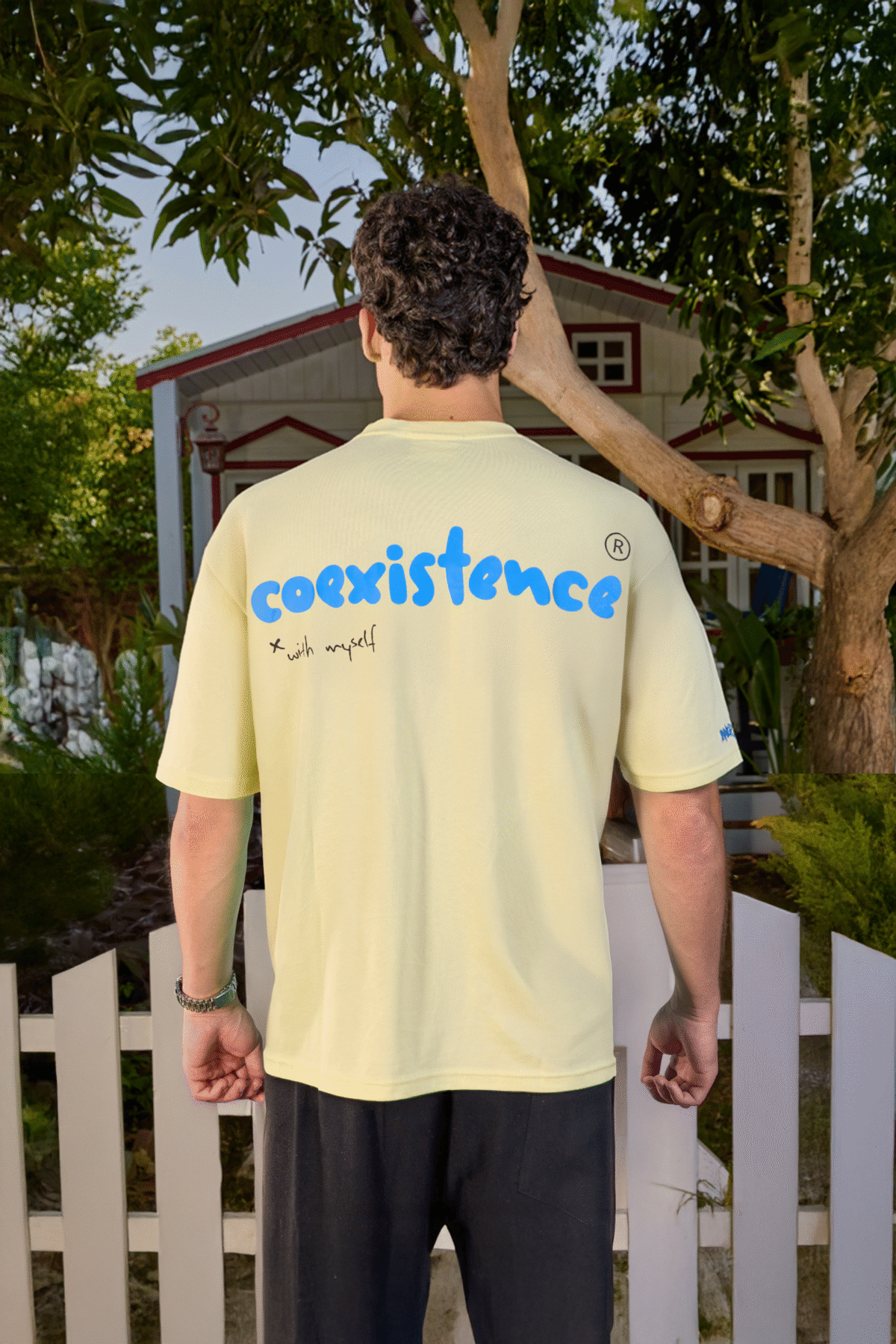 The back features bold blue text that simply reads “Coexistence With My Self”, a message that stays with you. On the sleeve, the embroidered phrase “Inner Peace” offers a subtle reminder of where real strength begins.
