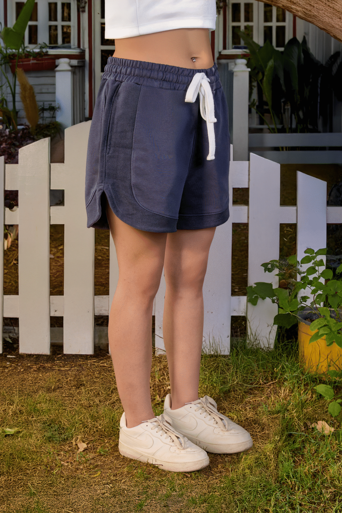 Move freely and confidently in our 100% cotton dolphin hem sweat shorts, now in a deep navy tone. Designed with a flattering curved silhouette and a feminine cut, these shorts blend sporty edge with everyday ease. The breathable cotton fabric keeps things cool and soft against the skin, making them perfect for summer days, laid-back weekends, or active moments on the go.