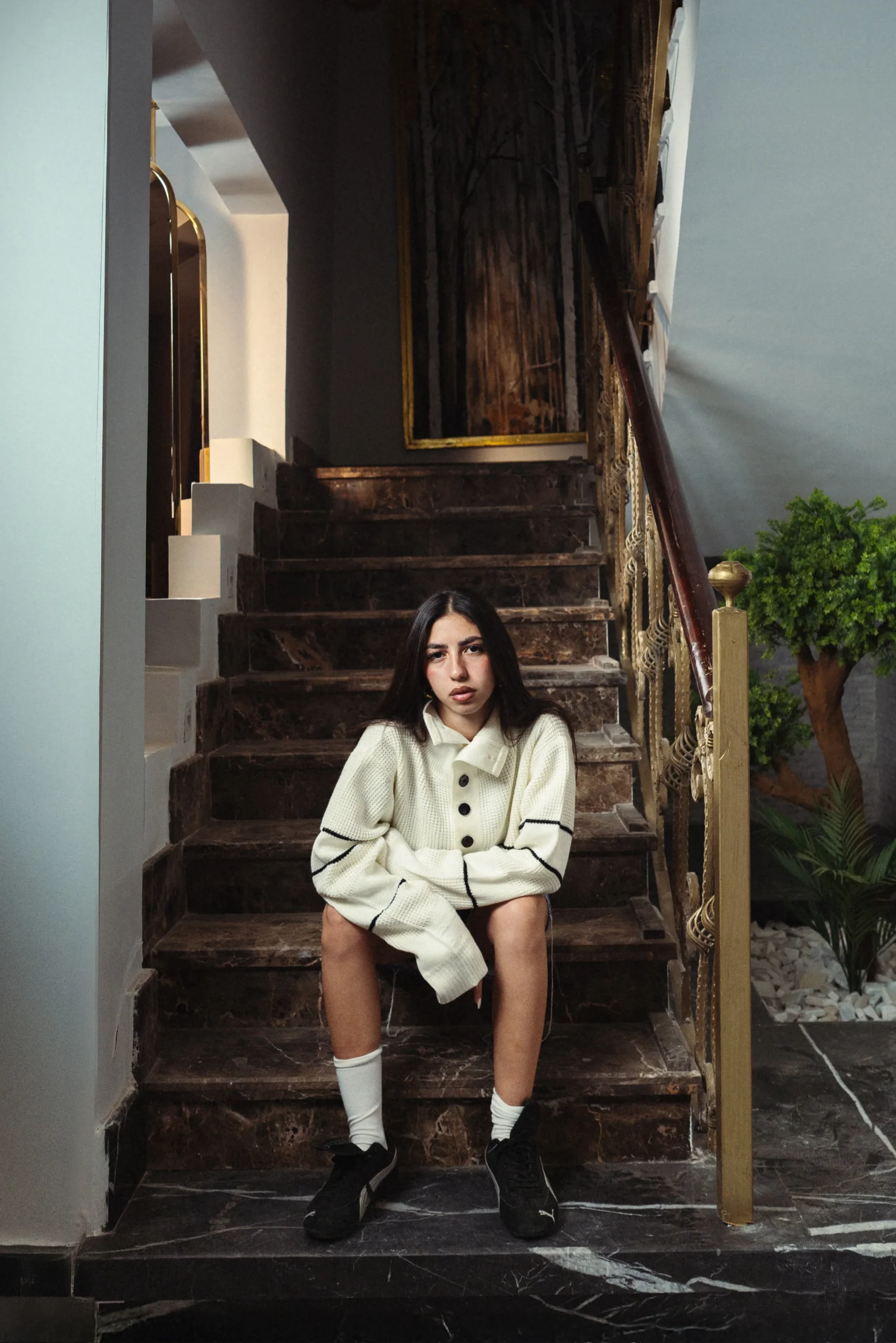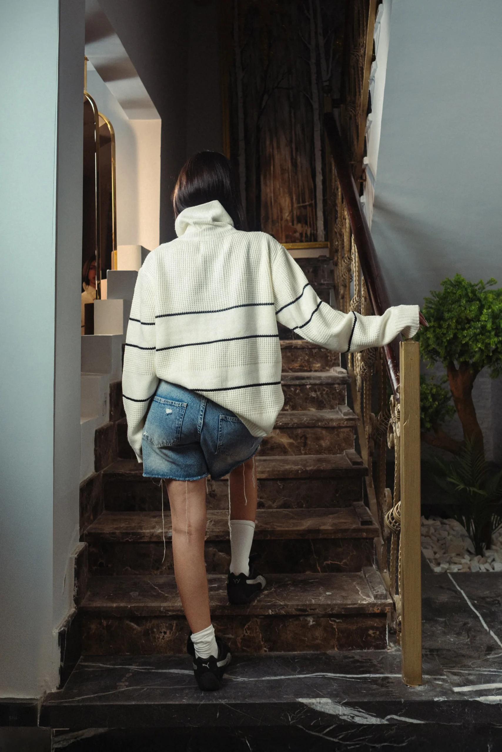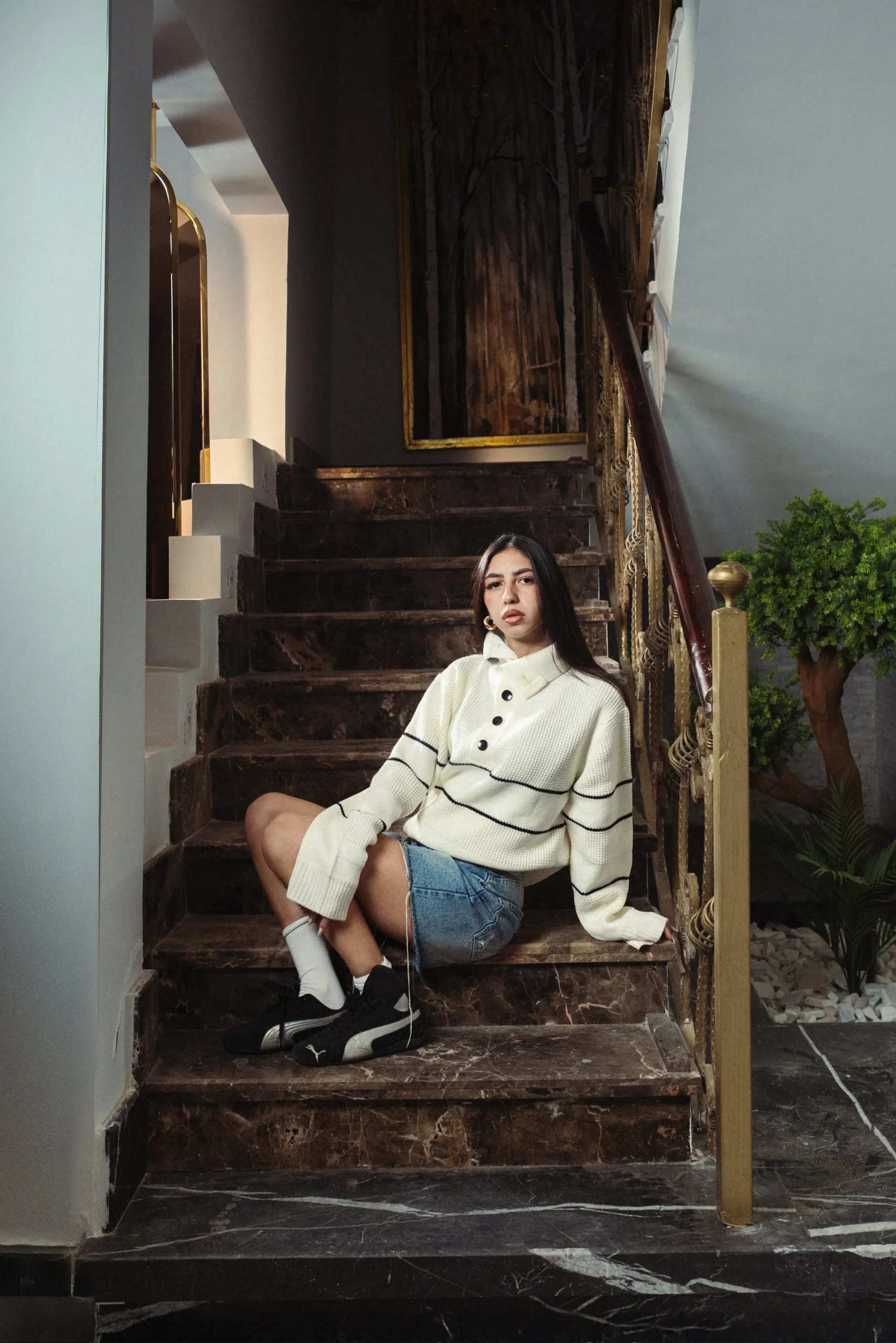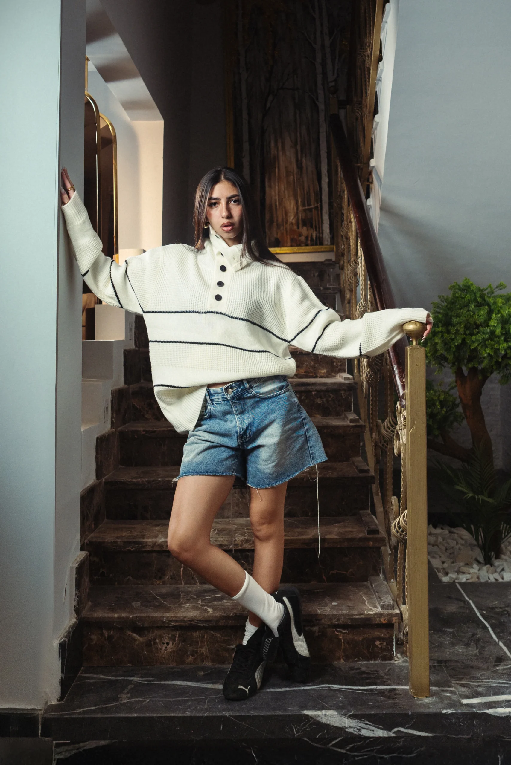 Crafted in an elegant Isabelline beige tone, this High Neck Knitted Pull is made from a viscose blend knit, offering a soft feel with a refined drape. Designed with an oversized fit, it features a high neck collar finished with buttons that allow the collar to be worn open or closed for versatile styling. Produced using premium fabrics with professional manufacturing and packaging, this piece reflects a thoughtful balance of comfort, quality, and modern design.