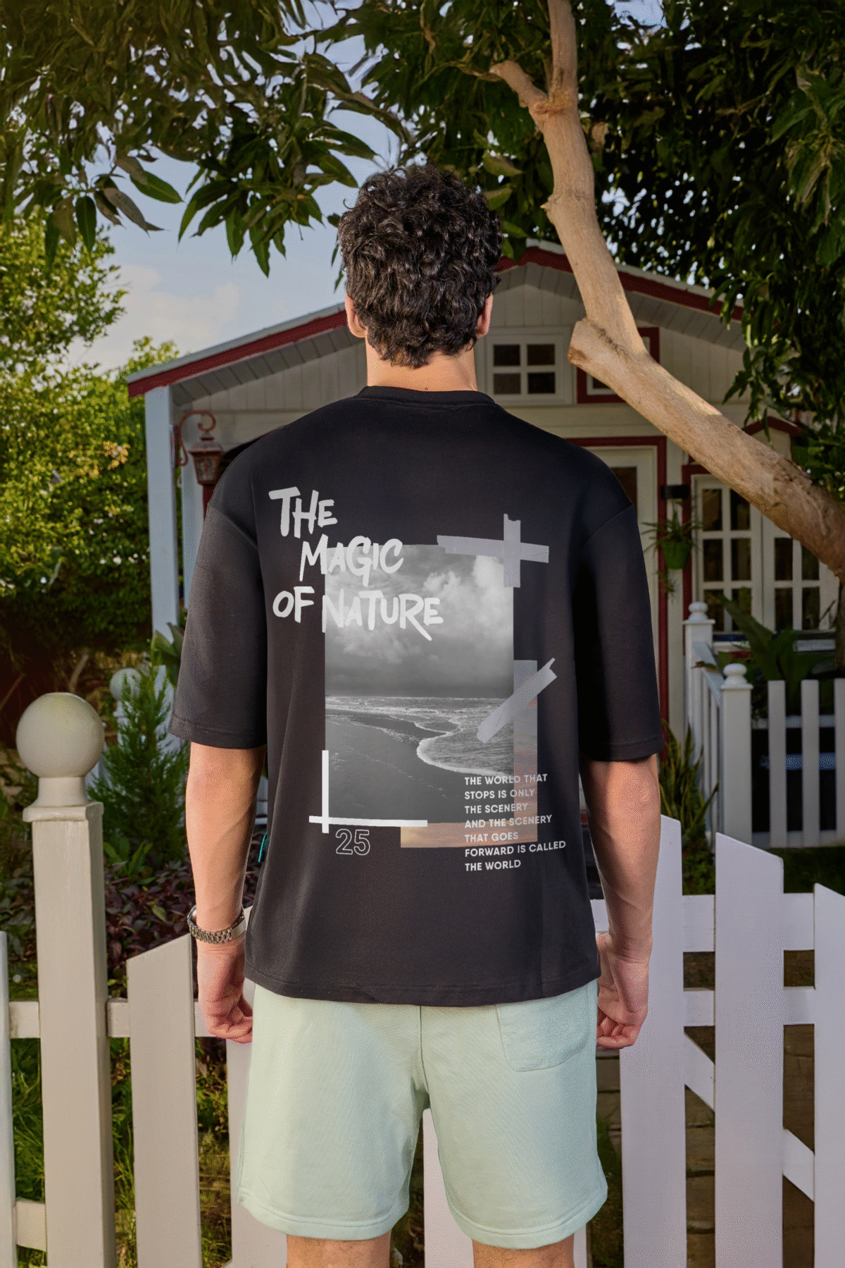 Find stillness in contrast with The Magic of Nature Tee. Made from 100% high-quality cotton in deep black, this piece captures the quiet power of nature through image and reflection. The front features a printed Allshades logo, minimal and grounded. On the back, two photographs, one of the sea, the other of a sunset, are “taped” in place with printed duct tape, creating a raw, layered visual that feels both spontaneous and intentional.