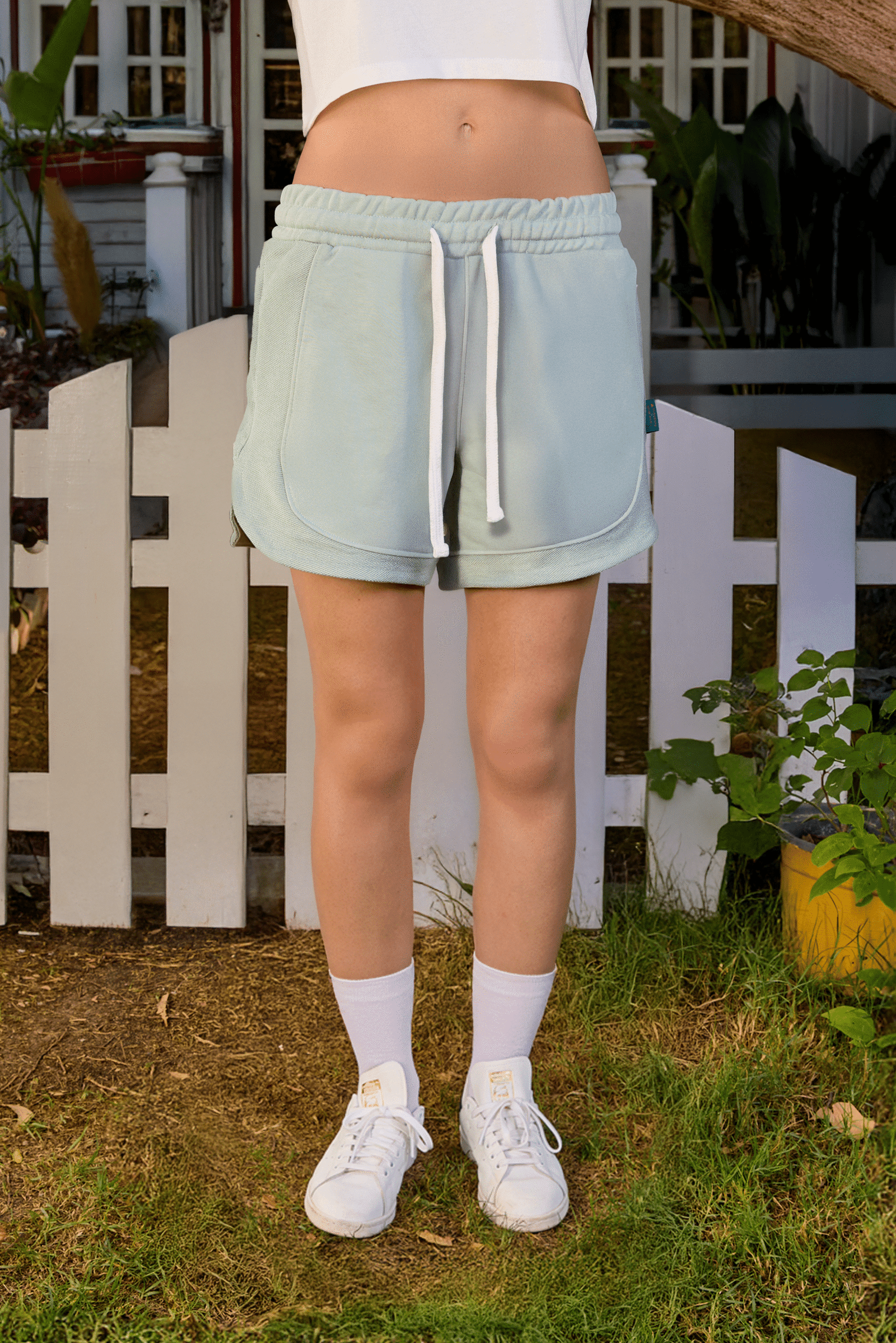Move freely and confidently in our 100% cotton dolphin hem sweat shorts, now in a fresh mint green tone. Designed with a flattering curved silhouette and a feminine cut, these shorts blend sporty edge with everyday ease. The breathable cotton fabric keeps things cool and soft against the skin, making them perfect for summer days, laid-back weekends, or active moments on the go.
