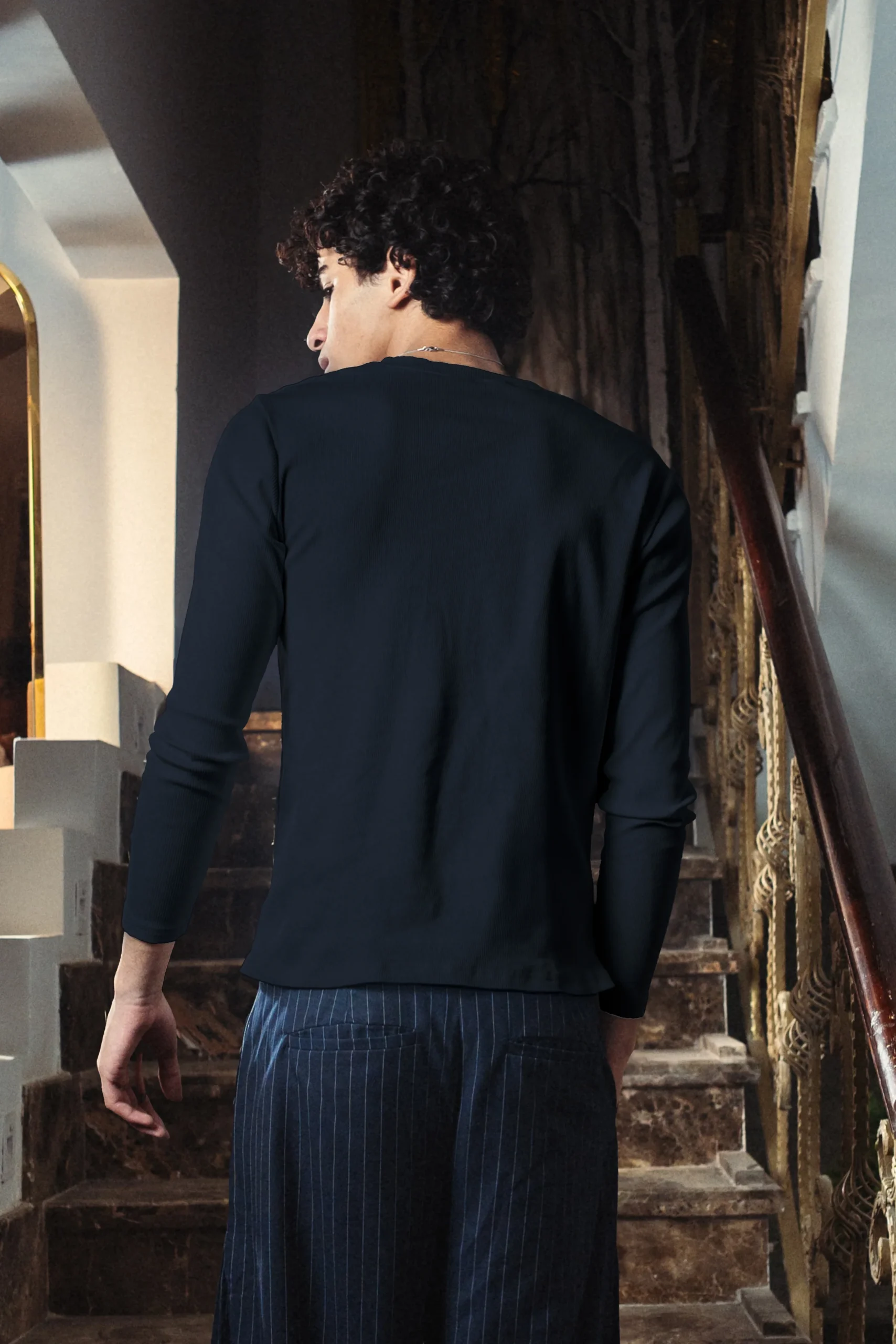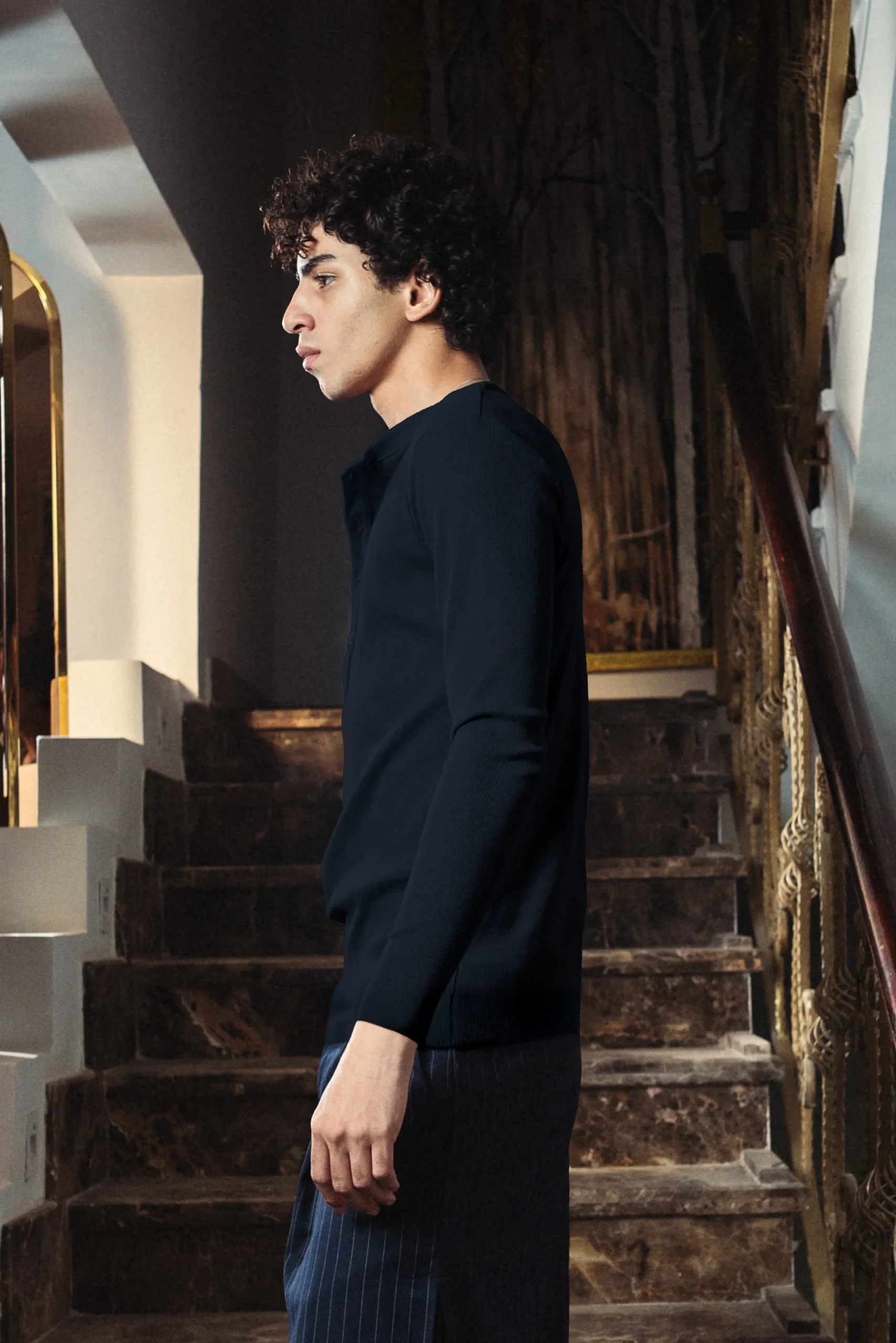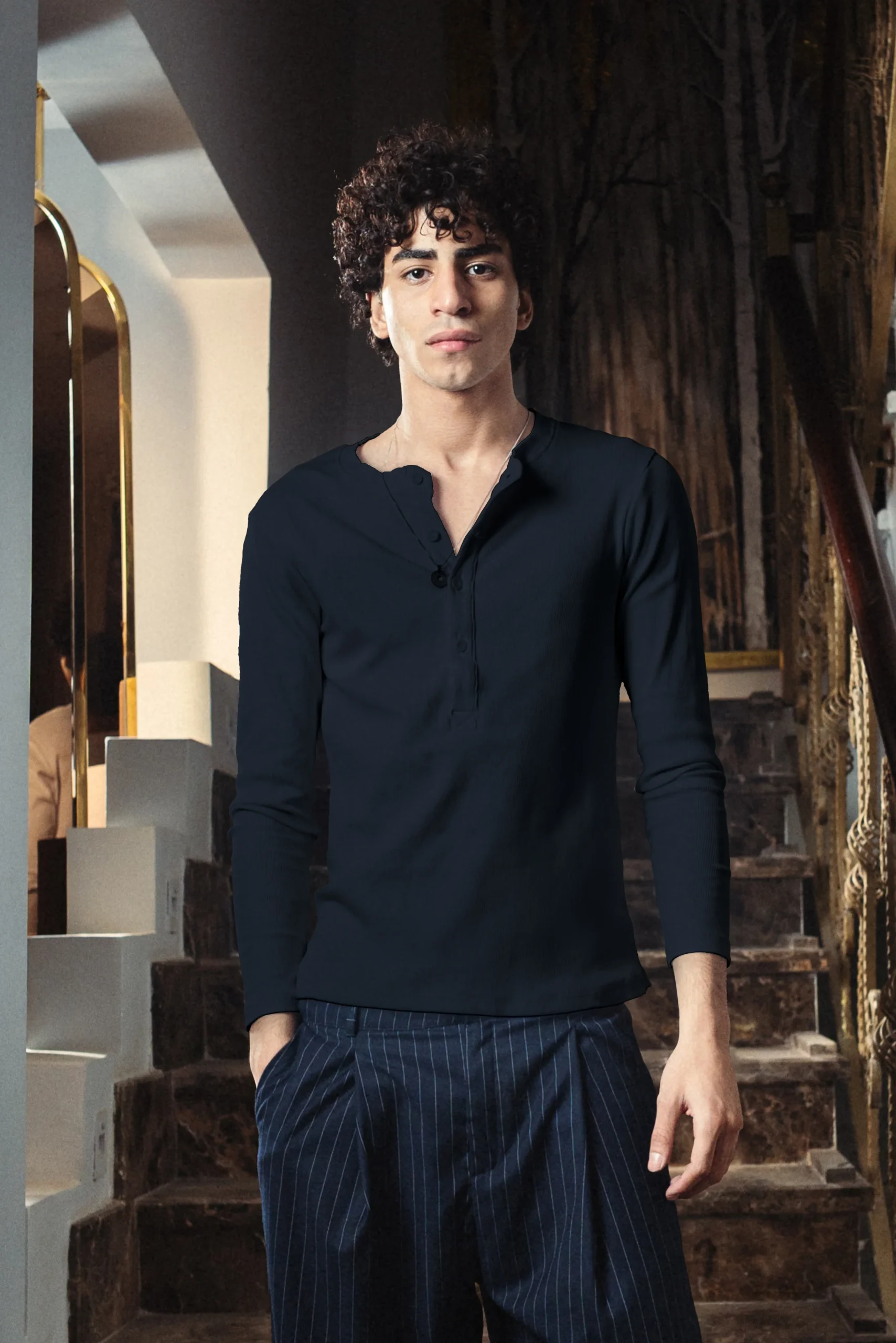 Designed in a refined Mystic Navy Blue tone, this Henley Shirt is crafted from fine rib cotton jersey with a high-stretch blend of 90% cotton and 10% elastane for a smooth, body-contouring fit. Finished with a long, buttoned Henley collar extending below chest level, it delivers a clean, structured silhouette with natural stretch and recovery. Also available in Black, White, Light Heather Gray, and Dark Heather Gray, this product is produced using premium fabrics with professional manufacturing and meticulous packaging.