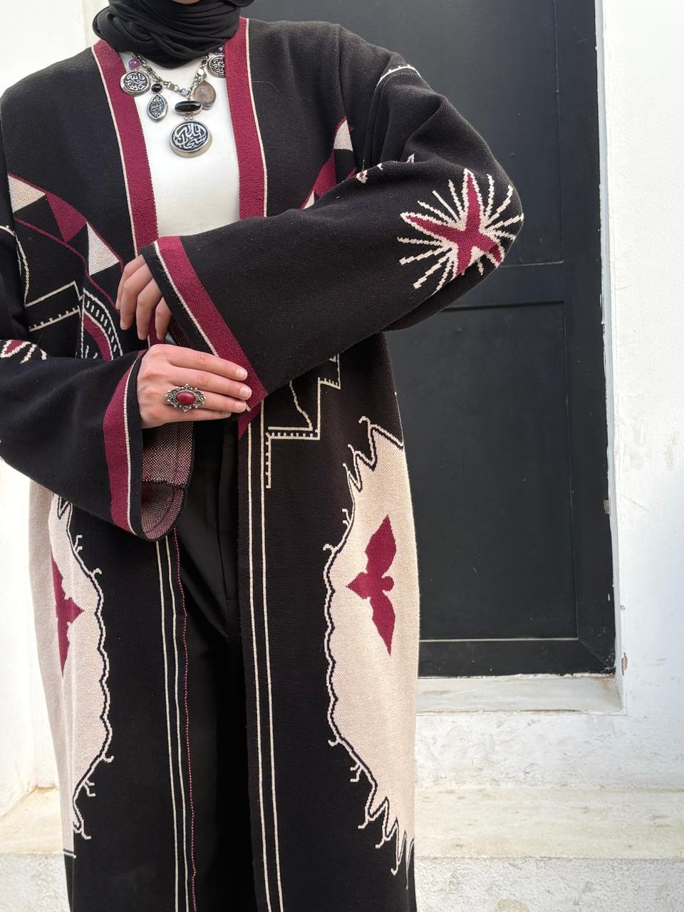 Elegant and versatile, the Qamar Cardigan comes in rich black and burgundy shades. Made from soft tricot, Perfect for layering and creating a refined, timeless outfit.